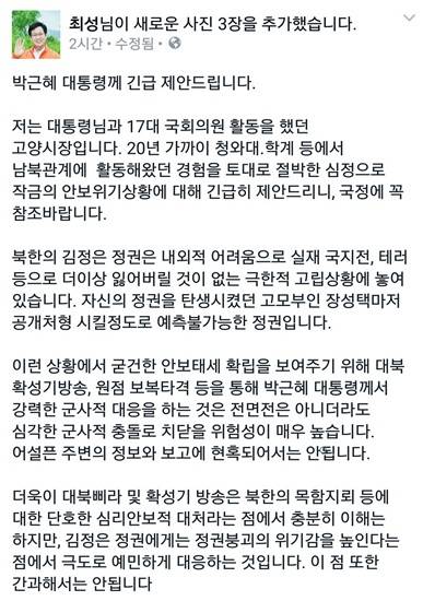 최성 고양시장은 22일 자신의 페이스북에 '박근혜 대통령께 긴급제안'이라는 글을 올려 20년 가까이 청와대, 학계 등에서 남북관계 전문가로 활동한 자신의 경험을 토대로 이같이 언급하며 그 이유를 조목 조목 짚었다.(전문을 사진 형식으로 하단에 삽입)