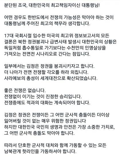 따라서 "어떤 경우도 한반도에서 전쟁의 가능성은 막아야 하는 것이 대통령님께 주어진 최고의 책무라 생각합니다"라며 "단호한 군사적 대처와 함께 가동할 수 있는 모든 남북관계 핫라인을 가동하셔야 합니다. 반기문 유엔사무총장을 비롯한 국제사회, 미국-중국을 비롯한 주변국과의 외교적 협력이 필요합니다. 국정원, 통일부, 외교부, 개성공단, 현재 방북 중인 민간단체 등을 오늘 이 순간부터 풀가동 하셔야 합니다"라고 언급했다.