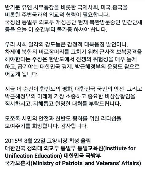 이에 더해 "우리 사회 일각의 강도높은 감정적 대북응징 발언이나 차제에 북한의 버르장머리를 고치기 위해 군사적 보복공격을 해야 한다는 주장은 한반도에서 전쟁의 위험성을 매우 높게하고, 급기야는 대한민국 경제, 박근혜 정부의 운명도 참으로 어둡게 됩니다"라며 직언을 서슴지 않았다.