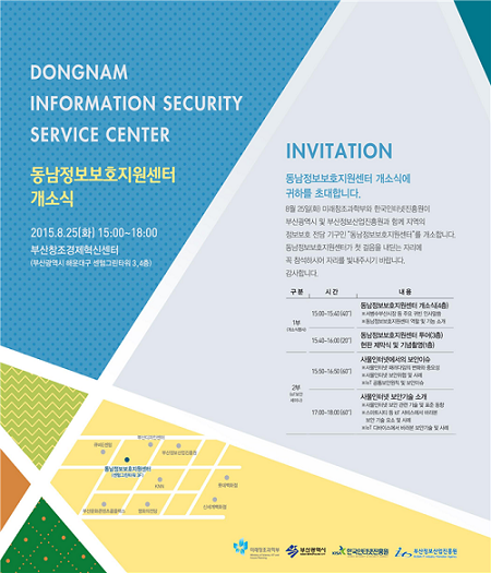 부산시는 동남권역의 영세·중소기업의 사이버 침해사고를 예방하고, 기업보안수준을 제고하는 한편, 정보보호 인력양성 등을 지원하게 될 '동남정보보호지원센터'를 오는 25일 오후 3시 부산창조경제혁신센터 내(3층)에 오픈한다고 24일 밝혔다.