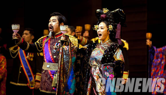 ▲뮤지컬 '명성황후'의 한 장면. 고종 역의 민영기(왼쪽)와 명성황후 역의 김소현이 열연 중이다.(사진=에이콤인터내셔날)