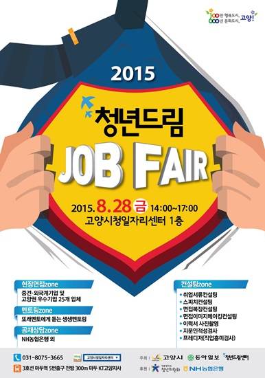 고양시(시장 최성)는 오는 28일 일산동구 마두동에 위치한 일자리센터에서 고양시와 동아일보청년드림센터 공동주관으로 대통령직속 청년위원회, NH농협은행이 후원하는 ‘청년드림 Job Fair' 일자리 행사를 개최한다고 밝혔다.