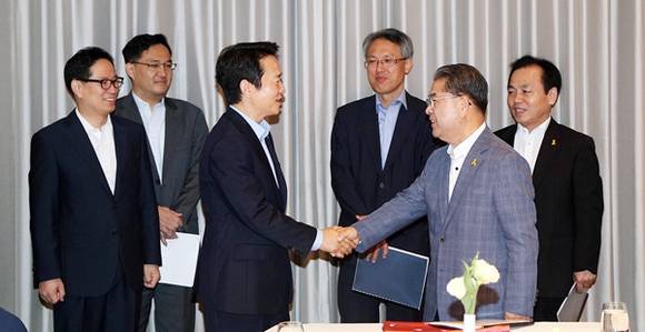▲27일 오전 수원소재 모 호텔에서 경기도와 교육청의 교육협력사업의 협의하기 위해 만난 남경필 경기도지사와 이재정 경기도교육감이 악수를 하고 있다.(사진=경기도)