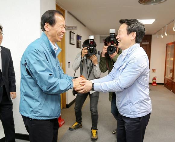 ▲지난 4월11일 경기도청 도지사 집무실 앞 복도에서 남경필 경기도지사와 최문순 강원도지사가 악수를 하며 인사를 나누고 있다. 남 지사는 강원도와 광역자치단체간 상생 연정을 시작으로 오는 31일 제주도와 두번째 상생 협력을 위한 협약을 체결할 예정이다.(사진=경기도)