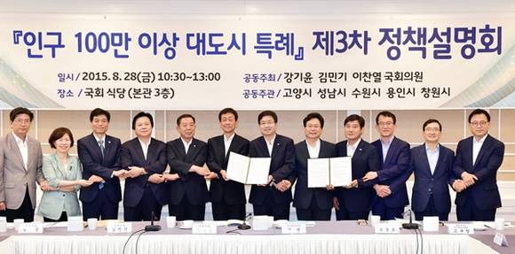 경기도 수원시, 고양시, 성남시, 용인시, 경남 창원시 등 인구 100만 이상 대도시의 법적지위 신설 및 특례방안 마련을 위한 관계기관 정책설명회가 28일 국회에서 열렸다.