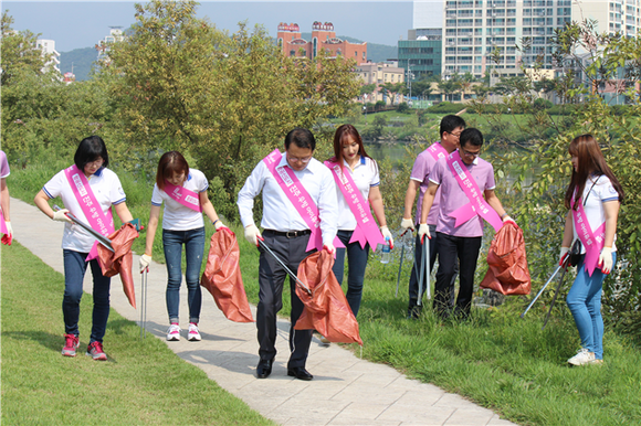 여름 막바지 무더위가 한창이었던 지난 28일, 아파트 건설사가 진주시내 일대 환경정화 봉사활동을 펼쳐 눈길을 끌었다.