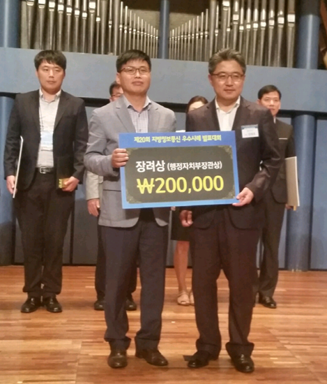 김포시(시장 유영록)가 지난 27일 행정자치부 주최로 대구시에서 열린 제20회 지방정보통신 우수사례 발표대회에서‘시민주도형 스마트타운 플랫폼 구축’으로 행정자치부장관상을 수상했다.