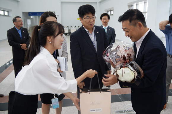 부산항만공사(BPA, 사장 우예종)는 오늘(31일)부터 본격적인 운영을 시작한 부산항 신국제여객터미널 2층 입국장에서 이날 첫 입항(오전 8시) 선박인 부관훼리 하마유를 통해 입국한 일본인 관광객에게 꽃다발을 증정했다.