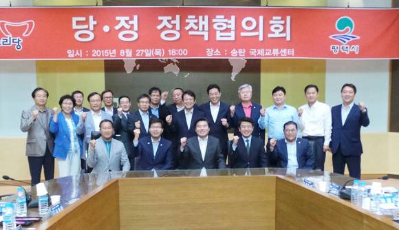 새누리당 원내대표 원유철(평택 갑)의원과 새누리당 원내대변인 유의동(평택 을)의원은 지난 27일 송탄 국제교류센터 컨벤션홀에서 공재광 평택시장 등이 참석한 가운데 당·정 정책협의회를 개최했다.