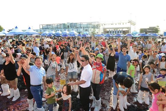 ▲송산포도축제에서 채인석 화성시장과 시민들이 포도 밟기 행사에 참여하고 있다.(사진=화성시)