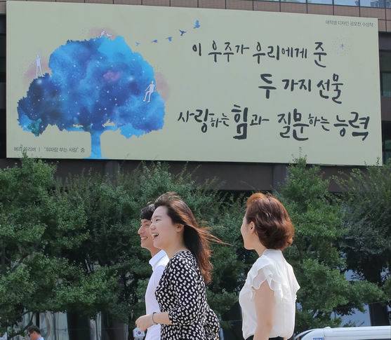 앞서 6월~8월까지 내걸린 여름편은 정희성 시인의 시 ‘숲’에서 따온 ‘제가끔 서 있어도 나무들은 숲이었어 / 그대와 나는 왜 숲이 아닌가’였다. 넉넉한 숲처럼 서로 배려하고 포용하며 살아가자는 메시지였다.