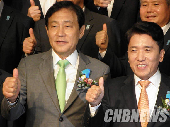 하나은행과 외환은행의 통합은행인 ‘KEB하나은행’이 1일 공식 출범했다. 이날 서울 을지로 본점에서 개최된 출범 기념행사에서 김정태 하나금융그룹 회장(사진 왼쪽)과 함영주 KEB하나은행장(사진 오른쪽)은 대한민국 1등을 넘어 글로벌 일류은행으로의 도약을 다짐했다. (CNB=이성호 기자)