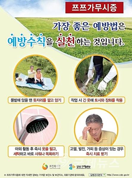 쯔쯔가무시증은 법정감염병 제 3군으로 주요증상은 두통과 고열, 오한, 구토, 피부발진, 근육통, 기침 등 일반 감기와 비슷한 증상이 나타나며 진드기 유충에 물린 부위에는 가피가 형성된다. 또한 심할 경우 기관지염, 신경염, 폐렴, 심근염 등이 발생할 수 있고 적절한 치료를 받지 않을 경우 사망에 이를 수 있는 치명적인 질병이다.