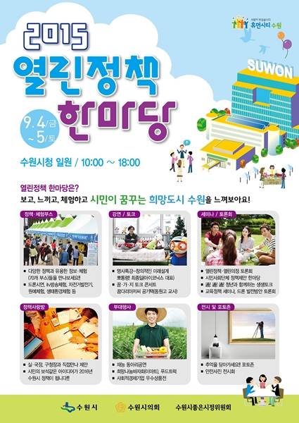 수원시(시장 염태영)는 오는 4~5일 이틀간 시민이 꿈꾸는 희망도시! 함께 만드는 더 큰 수원이라는 주제로 시청 일원에서 2015 열린정책 한마당을 개최한다.