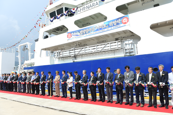 부경대학교(총장 김영섭)는 3일 오후 2시 부산 남구 용호만 매립부두에서 학생들의 승선실습 및 해양 연구조사 임무를 수행할 새 해양탐사선 '나라호'(선장 김정창 교수)의 취항식을 갖고 본격 운항에 들어갔다. 이 배는 총톤수 1494톤, 전장 70.7m, 폭 13.5m의 규모로 총 326억 원이 투입돼 ㈜한진중공업에서 건조됐으며, 제자리에서 360도 회전할 수 있고 수평이동이 가능하며 파도나 바람에 밀리지 않고 자동으로 자신의 위치를 유지하는 특별한 성능을 지니고 있다. (사진제공=부경대)