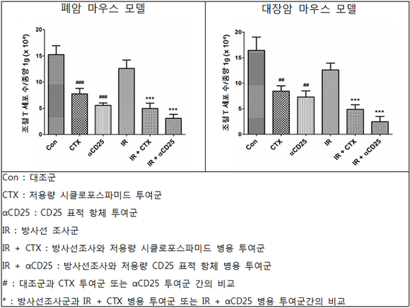 연구에 따르면, 폐암 및 대장암 마우스 모델 모두에서 방사선치료와 조절 T 세포 억제제(저용량 시클로포스파미드 또는 CD25 표적 항체)를 병용한 그룹에서 종양의 크기가 확연히 줄어들었고 생존율 또한 증가한다는 것을 확인했다.