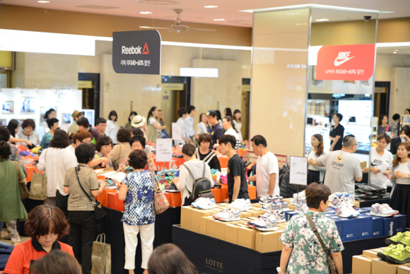 ▲런닝의 계절 가을이 다가오면서 스포츠 신발을 찾는 고객이 많아지고 있는 가운데, 롯데백화점 부산본점에서는 오는 6일까지 지하 1층 행사장에서 '나이키/아디다스/리복 초특가전' 행사를 진행하며 고객들이 쇼핑을 즐기고 있는 모습. (사진제공=롯데백화점)