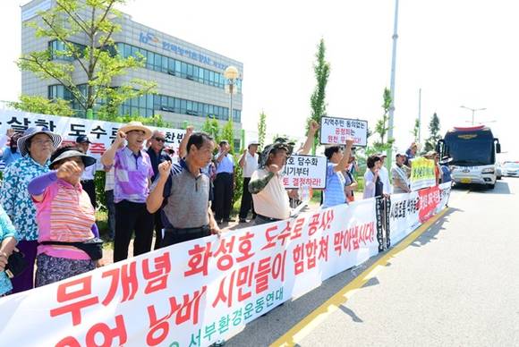 집회에 나선 화성시민들은 화성호 담수화 시기가 미 결정된 상태에서 농수제공용 도수로 건설은 부적절한 사업이라고 한 목소리를 냈다.