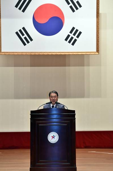 ▲7일 오전 수원 경기도교육청 대강당에서 열린 2015 8월말 퇴직교원 및 교육전문직원 훈.포장 전수식에서 남경필 경기도지사가 축사를 하고 있다.
