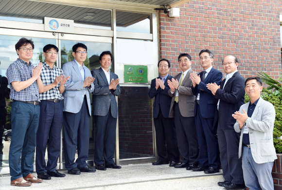 ▲LED-수산생물융합 생산 연구센터 개소식 참가자들이 현판식을 하고 있다. (사진제공=부경대)