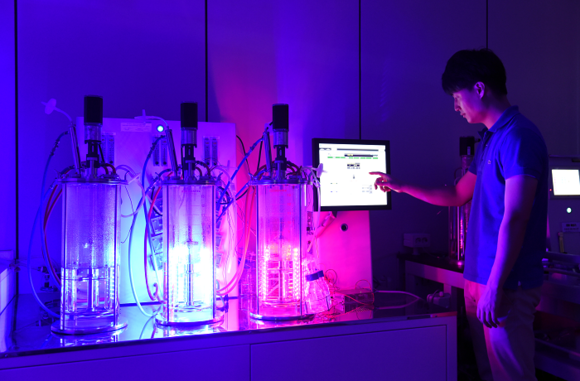 ▲미세조류 배양실에서 미세조류 대량배양기로 LED파장별 미세조류를 배양하는 모습.