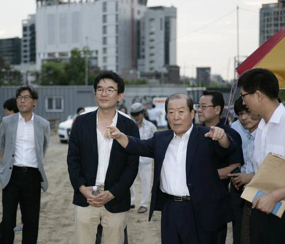▲박홍섭 마포구청장의 지역 상인들에 대한 발언 진위를 둘러싼 논란이 커지고 있다. 박 청장(왼쪽 세번째)이 지난 1일 경의선 홍대역사 사업부지에서 열린 경의선 책거리 조성사업을 위한 현장회의에 참석해 관계자들과 이야기를 나누고 있다. (사진=연합뉴스)
