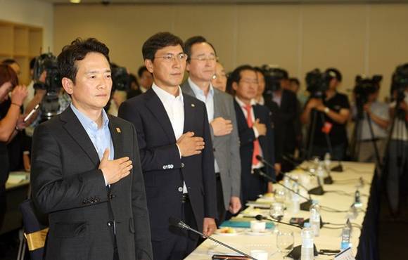 ▲9일 오후 인천 송도컨벤시아에서 열린 제32차 전국시도지사협의회 총회에서 남경필 경기도지사를 비롯한 전국시도지사들이 회의를 하기전 국민의례를 하고 있다.(사진=경기도)