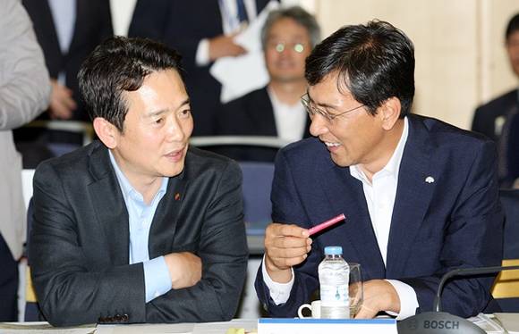 ▲9일 오후 인천 송도컨벤시아에서 열린 제32차 전국시도지사협의회 총회에서 남경필 경기도지사가 안희정 충청남도지사와 환담을 나누고 있다.