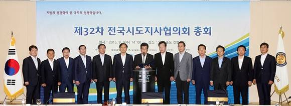 ▲9일 오후 인천 송도컨벤시아에서 열린 제32차 전국시도지사협의회 총회에서 이시종 전국시도지사협의회장이 공동성명서를 발표하고 있는 가운데 남경필 경기도지사를 비롯한 전국 시도지사들이 함께 하고 있다.(사진=경기도)