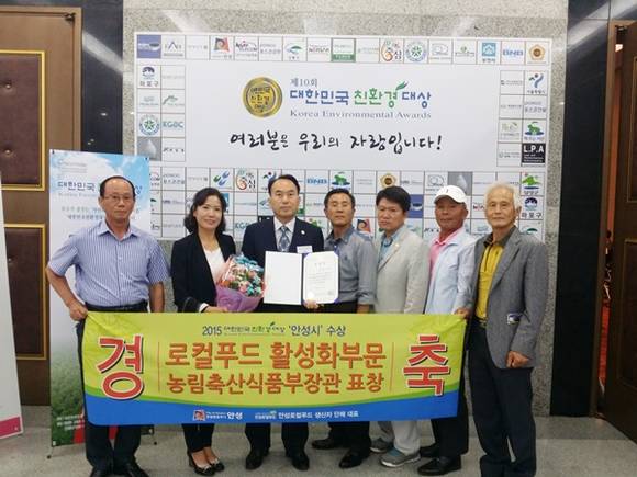 안성시(시장 황은성)는 지난 9일 서울 중소기업중앙회에서 열린 2015 대한민국 친환경대상 시상식에서 친환경 지역공동체 텃밭농원 조성 및 안성맞춤 로컬푸드 시민운동 전개에 앞장선 공로로 농림축산식품부장관 기관표창을 수상하는 쾌거를 이뤘다.