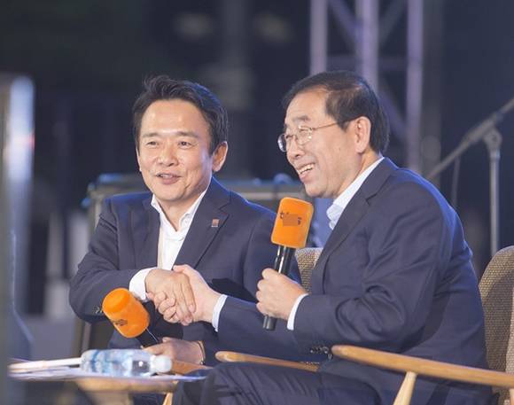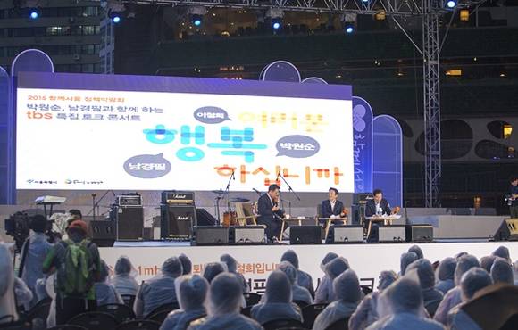 지난 11일 오후 서울광장에서 여러분!행복하십니까?라는 주제로 남경필 경기도지사가 박원순 서울시장과 이철희 두문정치전략연구소 소장의 진행으로 토크콘서트를 열었다.