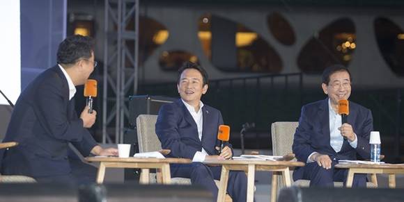 ▲지난 11일 오후 서울광장에서 열린 남경필도지사.박원순 서울시장 토크콘서트 여러분!행복하십니까? 에서 남경필 경기도지사가 박원순 서울시장과 이철희 두문정치전략연구소 소장의 진행으로 토크콘서트를 하고 있다.(사진=경기도)