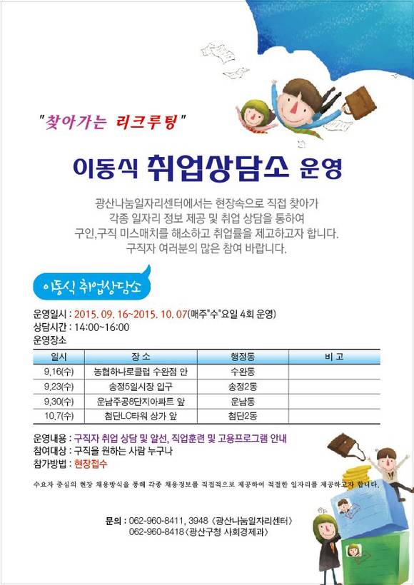 광산구 관계자는 “일자리 정책에서도 현장과 구민 중심 정책을 펴자는 취지로 찾아가는 이동식 취업상담소를 추진한다”며 “개인 맞춤형 취업지원 프로그램과 서비스 제공으로 구직자들이 더 좋은 일자리를 얻을 수 있도록 연결하겠다”고 밝혔다.