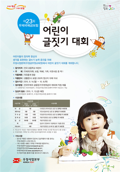 우정사업본부 부산지방우정청은 효율성과 편리함에 익숙한 요즘 어린이에게 따뜻한 정서를 일깨우고, 글쓰기 실력과 창의력 향상을 돕기 위해 '우체국예금보험 어린이 글짓기대회'를 개최한다고 15일 밝혔다.