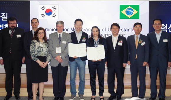 ▲15일 대구창조경제혁신센터 출범 1주년 기념식에서 삼성과 브라질 혁신기업협회(ANPROTEC)가 벤처, 스타트업 발굴 및 육성 협력을 위한 계약을 맺었다. (왼쪽 다섯번째부터 김선일 대구창조경제혁신센터장, 프란시스 가르시아 브라질 혁신기업협회 의장, 권영진 대구시장, 이상훈 삼성전자 사장). (사진제공=삼성전자)
