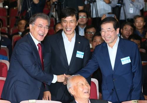 ▲새정치민주연합 문재인 대표(왼쪽 부터), 안희정 충남지사, 박원순 서울시장이 16일 국회 의원회관에서 열린 제2차 중앙위원회의에서 인사를 나누고 있다. (사진=연합뉴스)