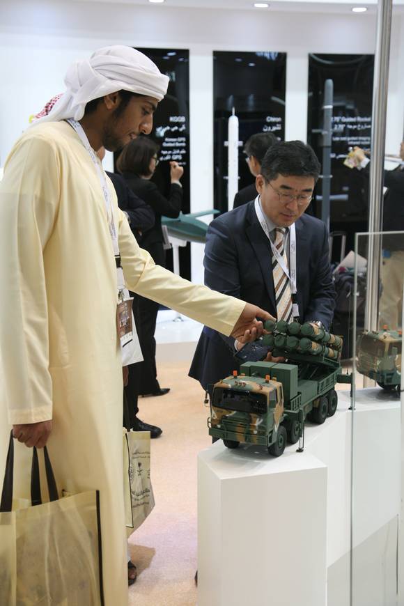 ▲LIG넥스원이 지난 2월 22일(현지시각) 아랍에미리트(UAE) 아부다비에서 개막된 국제 방위산업전시회 'IDEX 2015'에 참가, UAE 군 관계자를 비롯한 중동지역 국가 군 관계자들을 대상으로 정밀유도무기 등 최첨단 무기체계와 세계적 수준의 R&D 기술 역량을 알리고 있다. (사진제공=LIG넥스원)