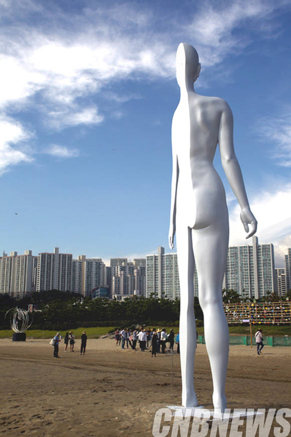 ▲9월 18일 부산 다대포 해수욕장에서 진행된 2015 바다미술제 작품 공개설명회에 선보인 조각가 김영원의 '그림자의 그림자(홀로 서다)'.(사진=왕진오 기자)