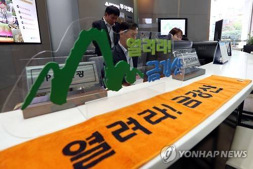 ▲지난달 25일 오후 서울 연지동 현대아산 본사 1층 로비에 마련된 현대아산 투어센터에서 직원들이 업무를 보고 있다. (사진=연합뉴스)