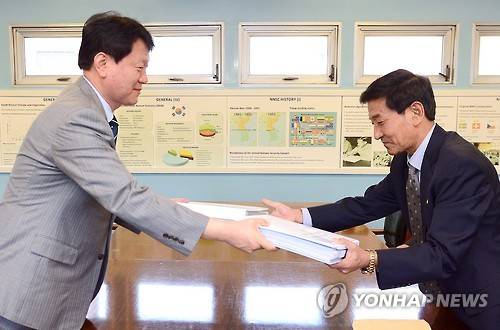 ▲남측과 북측 연락관들이 15일 오후 판문점에서 이산가족 생사확인 의뢰서를 교환하고 있다. 남측 의뢰서에는 일반 이산가족 200명과 국군포로 이산가족 50명의 주소와 나이, 이름, 북측 가족 관계 및 이름 등이 적힌 명단이 포함됐다. (사진=연합뉴스)