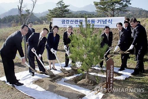 ▲현정은 현대그룹 회장(왼쪽 세 번째)이 지난해 11월18일 금강산에서 열린 관광재개 기원 공동 식수행사에서 원동연 북한 조선아시아태평양평화위원회 부위원장(왼쪽 두 번째), 조건식 현대아산 사장(왼쪽 네 번째)과 함께 식수하고 있다. (사진=연합뉴스)