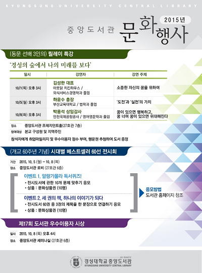 이번에 마련한 경성대 중앙도서관의 문화행사는 크게 3가지로 구분해 진행된다. '동문 선배 3인과 함께하는 릴레이 특강'이 있고, '시대별 베스트셀러 60선 전시회'가 있으며, '도서관 우수이용자 시상'이 마지막 날 진행된다.