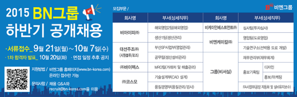 이번 공개채용에 대한 자세한 내용은 비엔그룹 홈페이지에서 확인할 수 있으며 recruit@bn-korea.com으로 이메일 문의도 가능하다.