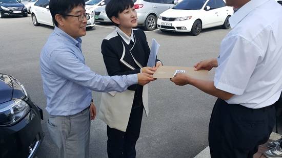 ▲안소희 시의원과 이윤근 부소장이 파주엘지디스플레이 대표와 담당자를 대신 경비직원에게 공식 요청서를 전달하고 있다.(사진= 김진부 기자)