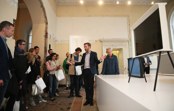 ▲‘삼성 세리프 TV’ 디자이너 로난 & 에르완 부훌렉 형제가 제품 디자인에 대해 설명하고 있다. (사진제공=삼성전자)
