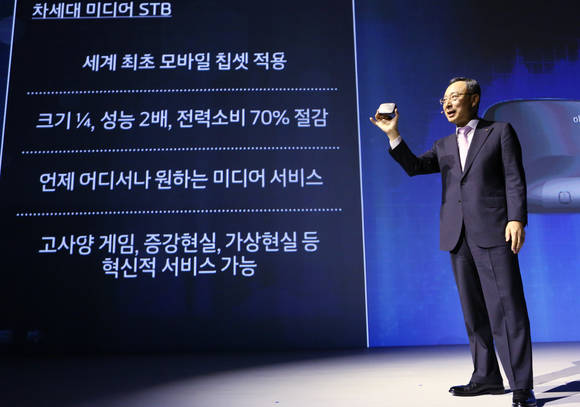 ▲황창규 회장이 세계 최초로 삼성전자의 모바일 칩셋을 적용해 크기는 4분의 1로 줄인 반면 성능은 2배, 전력 소비는 70% 감소시킨 차세대 미디어 셋탑박스를 선보이고 있다. (사진제공=KT)