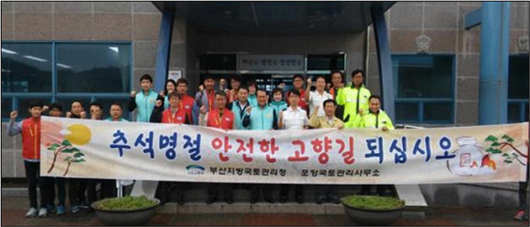 한편, 부산국토청은 추석 연휴기간동안 국민들에게 안전운전 당부 및 홍보를 위해 관계기관 합동으로 지난 17일과 23일 각각 포항톨게이트와 영주톨게이트에서 교통안전캠페인을 시행했고, 추석 연휴기간 전인 25일 영남권 주요 톨게이트 및 휴게소 등에서 유관기관 합동 교통안전캠페인 활동을 펼칠 계획이다.