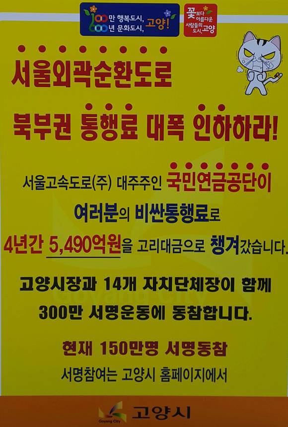 최성 고양시장은 25일 오전 9시 30분부터 서울외곽순환도로 고양톨게이트에서 서울외곽순환고속도로 통행료 인하 요구 1인 시위를 벌이고 있다. 이후에는 전용차량인 소형차에 부당한 통행료 개선 및 국민연금공단의 시정을 촉구하는 홍보 플랭카드를 달고 일산IC까지 운행 시위를 계속할 예정이다.