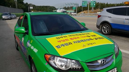 ▲최성 고양시장이 전용차에 홍보물을 붙이고 운행 시위를 하고 있다.(사진= 김진부 기자)