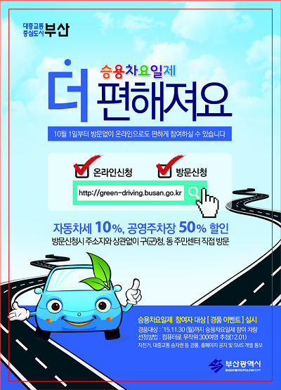 시는 승용차 요일제 운영강화 계획을 수립하고 시스템 고도화 구축 용역을 발주했다. 이에 따라 10월 1일부터 차주가 PC나 스마트폰 등 모바일 홈페이지(green-driving.busan.go.kr)를 통해 승용차 요일제 참여신청을 하면 차량에 붙이는 전자인증표를 우편으로 보내주는 시스템이 마련됐다.